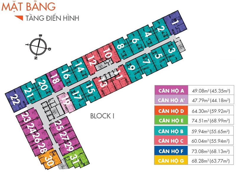 Mỗi căn hộ ở đây có diện tích từ: 47 m2 - 75 m2, thiết kế đa dạng từ 1, 2, 3 phòng ngủ.