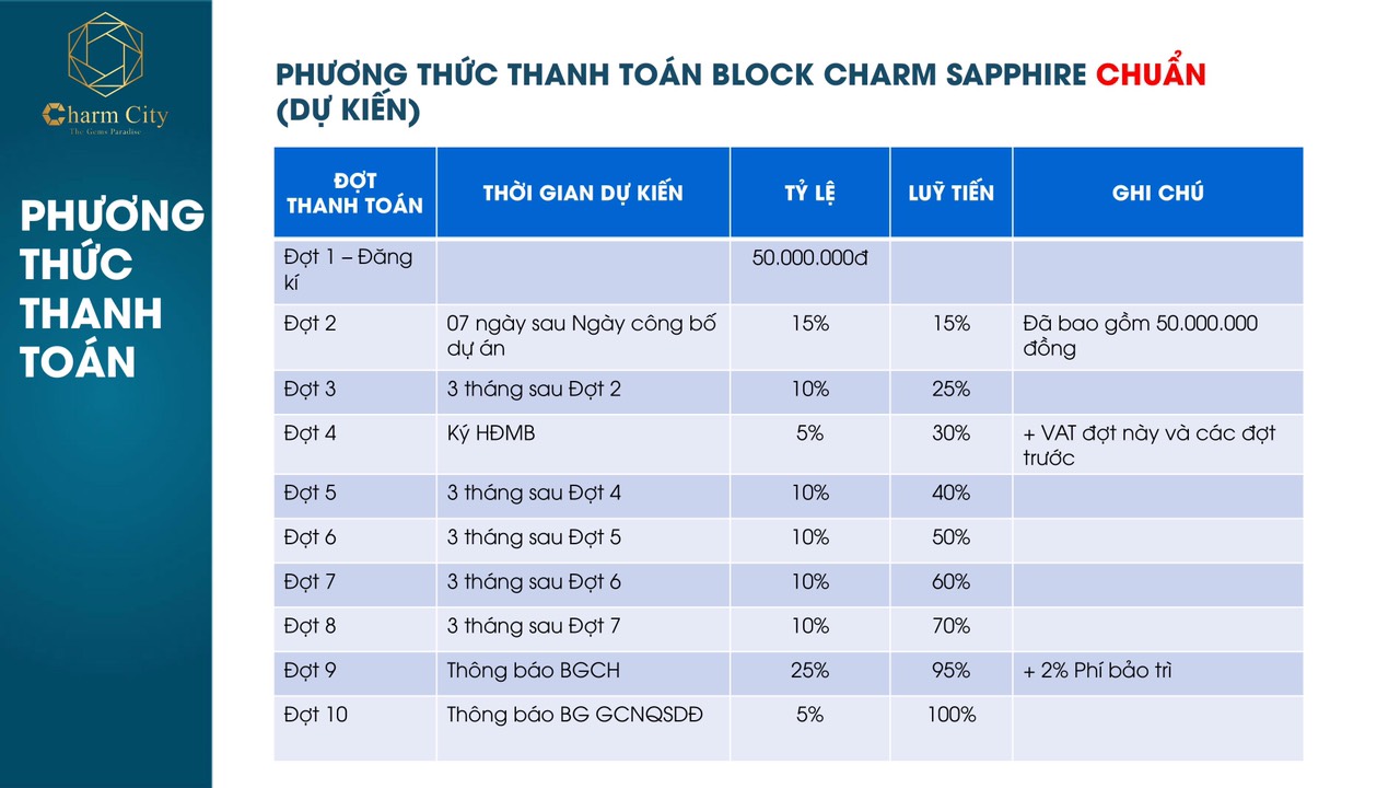 TIẾN ĐỘ THANH TOÁN CHUẨN CỦA CHARM CITY DĨ AN BLOCK RUBY