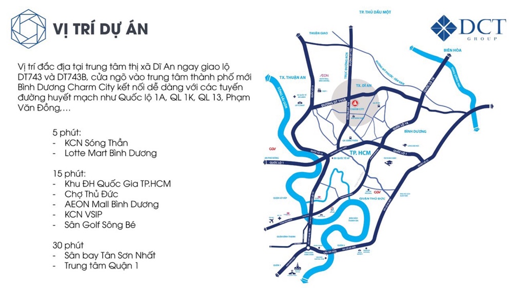 - Từ Charm Sapphire có thể kết nối với các tuyến đường huyết mạch của khu vực như: DT743, Quốc lộ 1A, Quốc lộ 1K, Quốc lộ 13, cao tốc Mỹ Phước – Tân Vạn, …